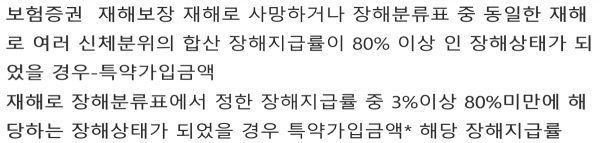 보험증권  재해보장 재해로 사망하거나 장해분류표 중 동일한 재해로 여러 신체분위의 합산 장해지급률이 80% 이상 인 장해상태가 되었을 경우-특약가입금액 재해로 장해분류표에서 정한 장해지급률 중 3%이상 80%미만에 해당하는 장해상태가 되었을 경우 특약가입금액* 해당 장해지급률